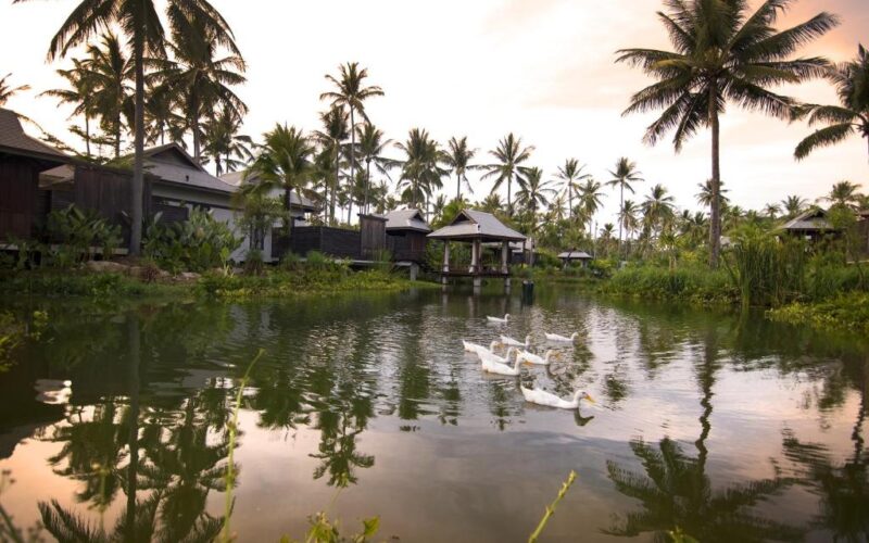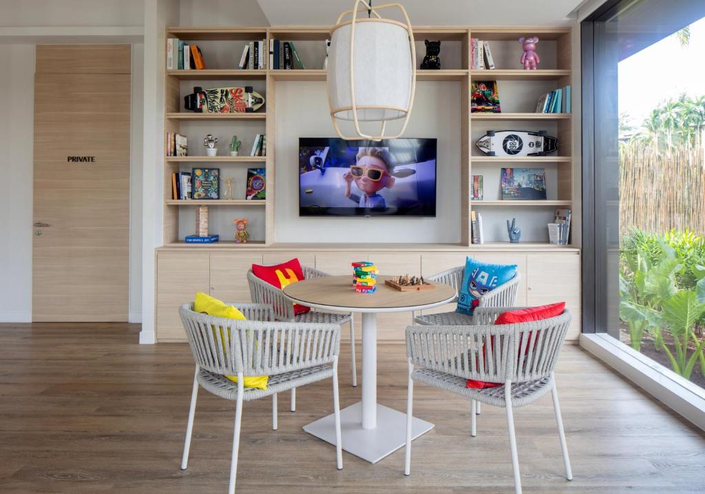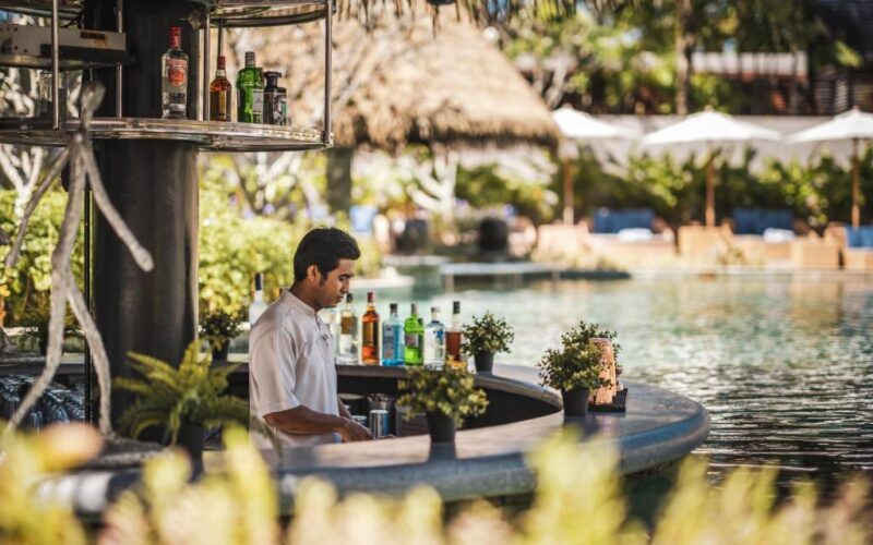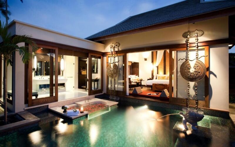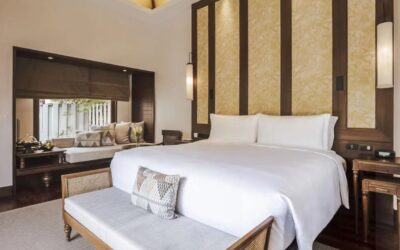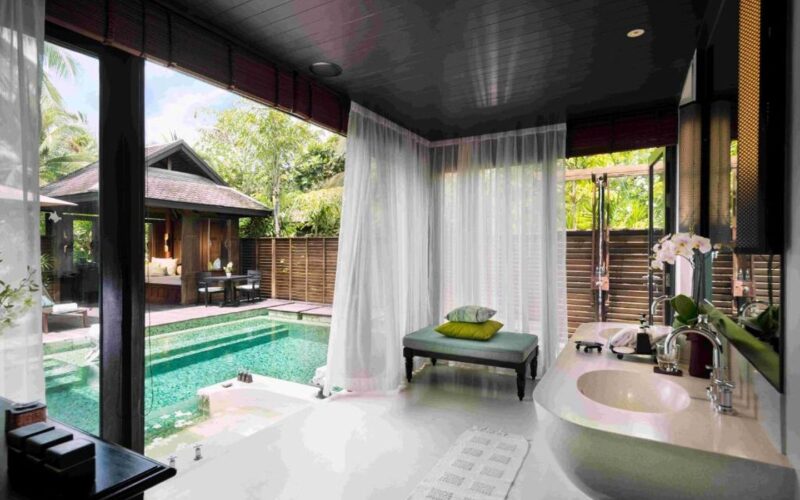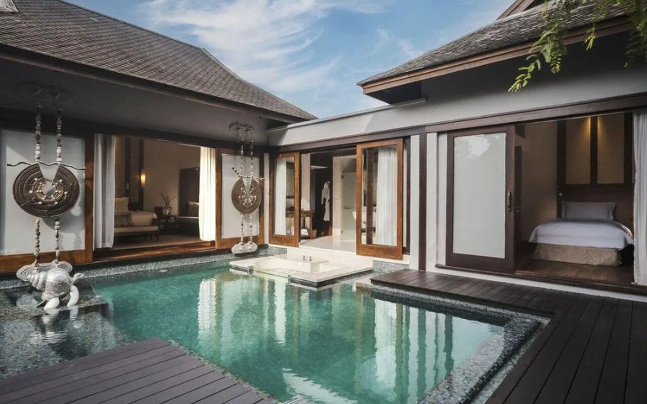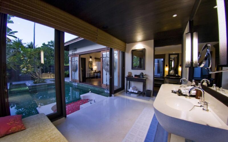 The villa features two fully independent pool villas linked by an internal connection, perfect for two families travelling together or couples seeking both shared space and privacy. Each villa features its own master bedroom (king bed) and ensuite bathroom with seamless indoor-outdoor flow onto your private pool. A generous private pool shared between the two sections, with a sundeck for lounging, al-fresco dining sala, and outdoor bathing options (sunken tub / rain shower) to maximize the tropical setting. Lush tropical surrounds, premium villa finishes, and the privacy of a standalone villa experience, yet within the resort’s superb amenities and beach access.