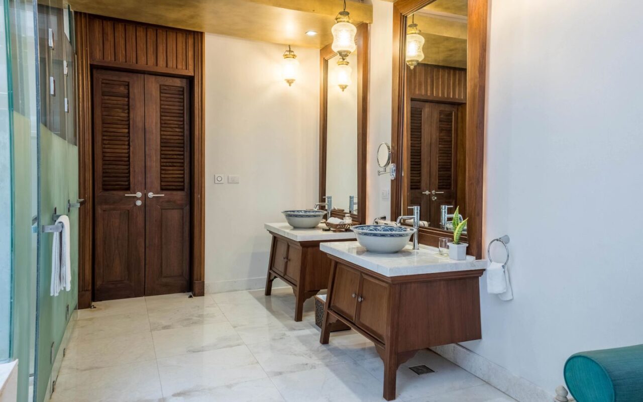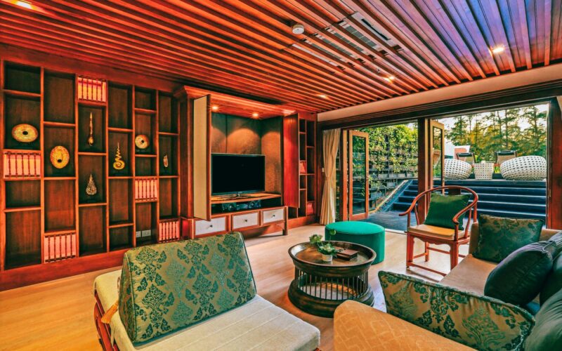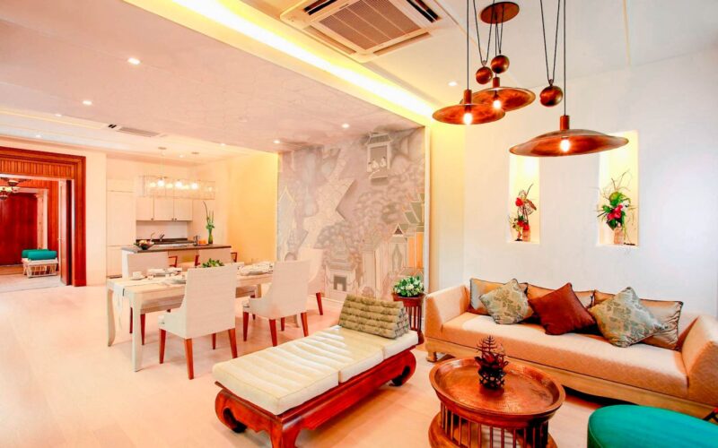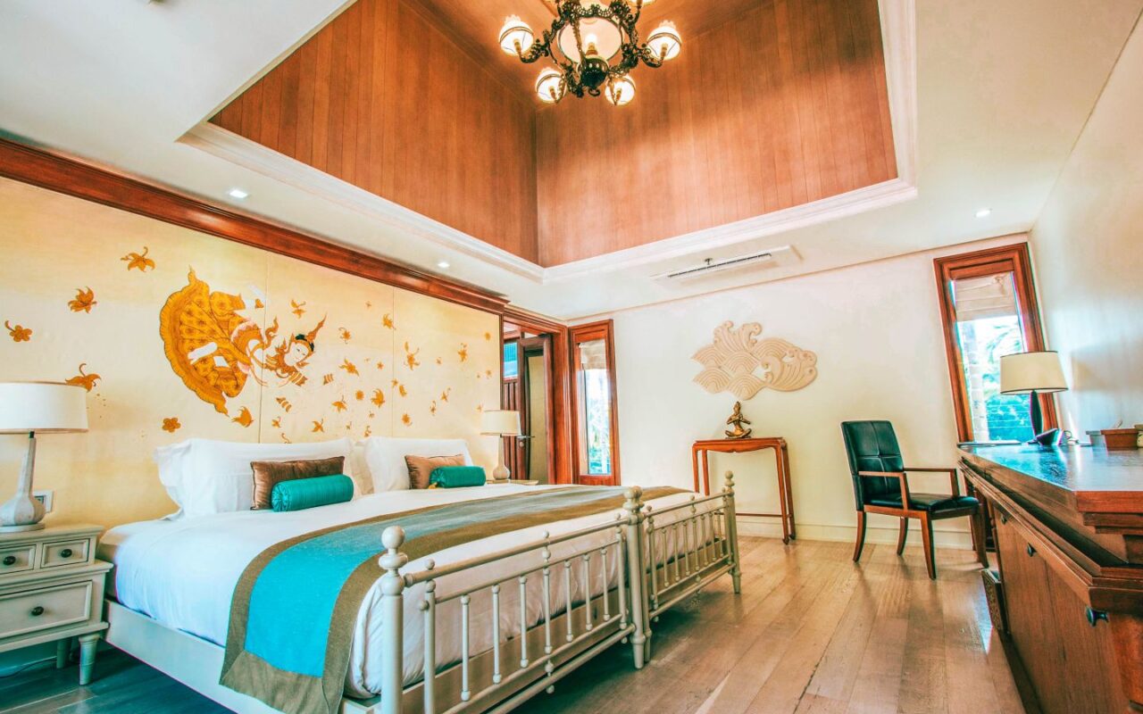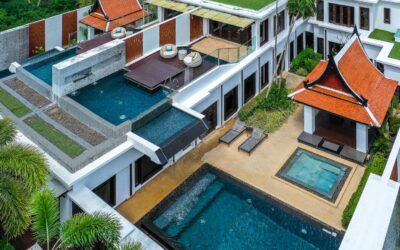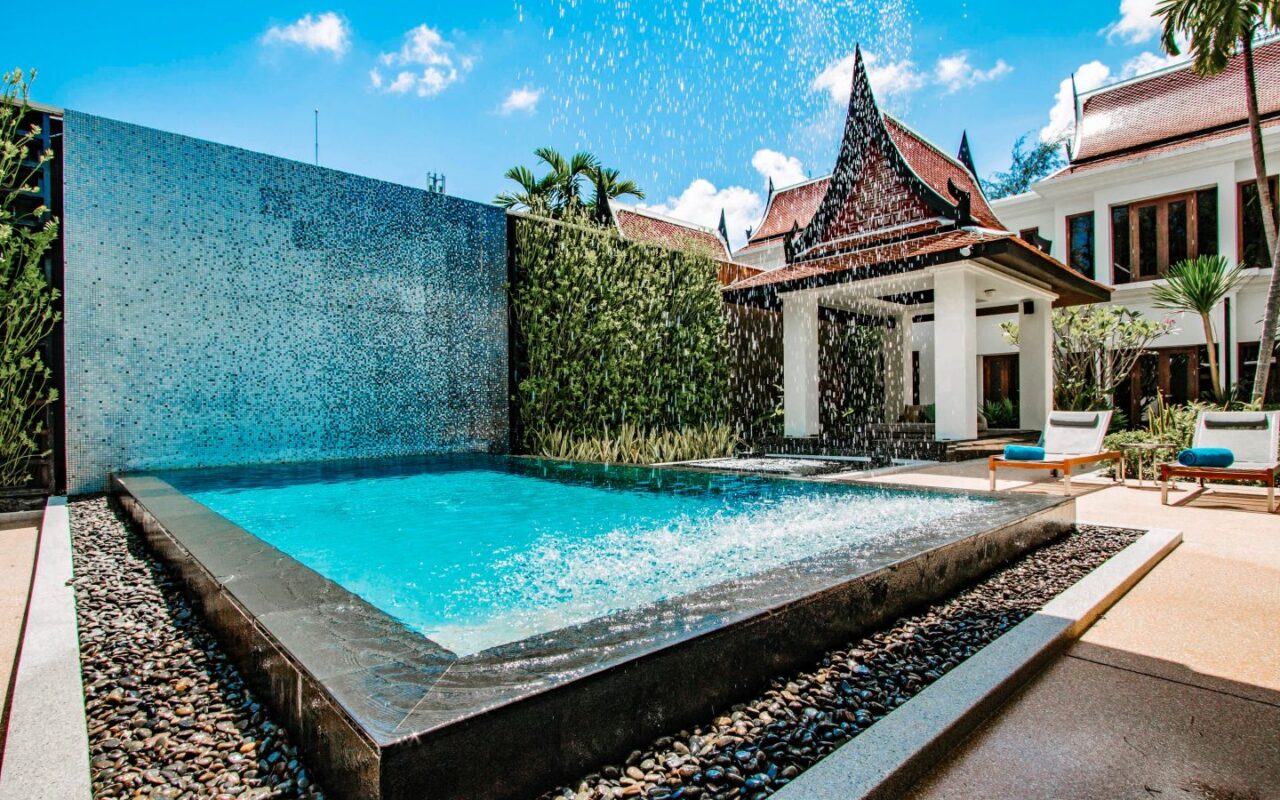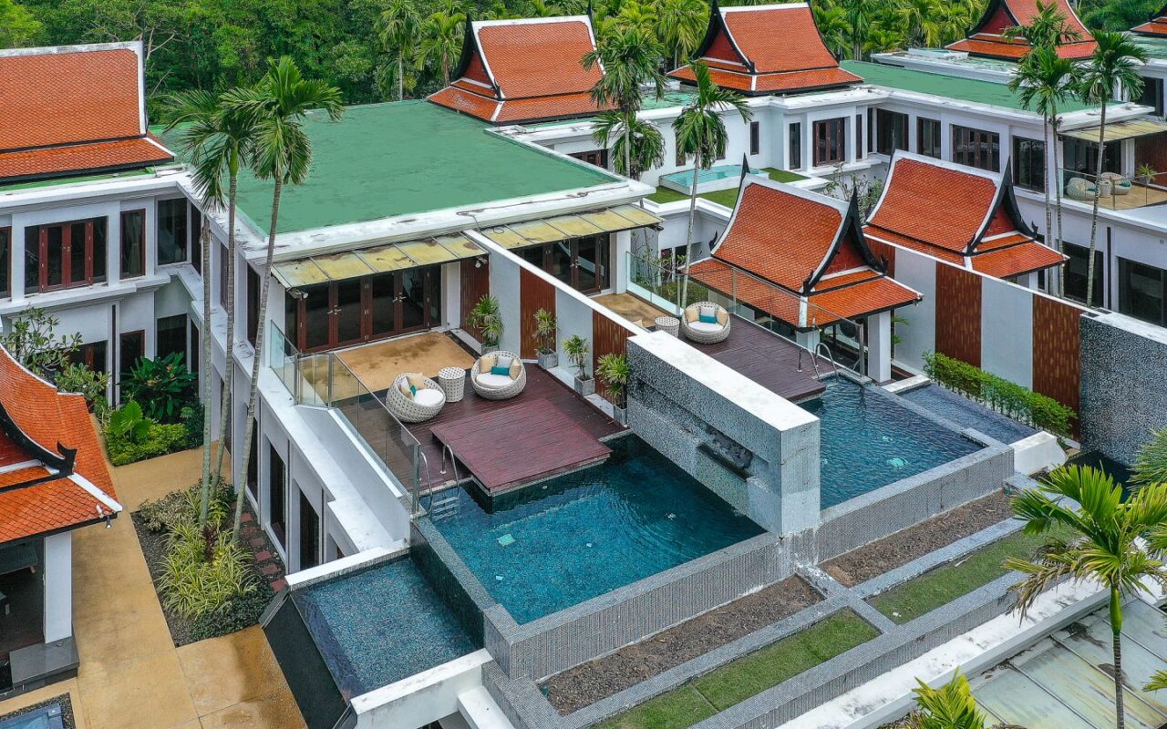 Exquisite Thai and Continental furnishings include fine Thai silk and hand-painted walls. The grand marble staircase to the second floor leads you to a separate living room, separate kitchen/bar, a rooftop sun terrace, a third saltwater pool. The sunset from the deck beside the cascading waterfall pool is dramatic, romantic and mesmerising.