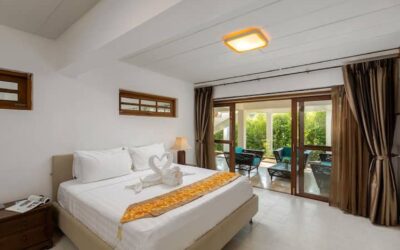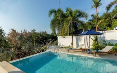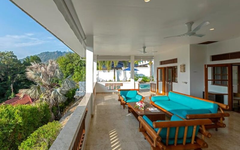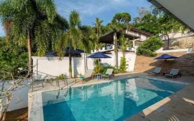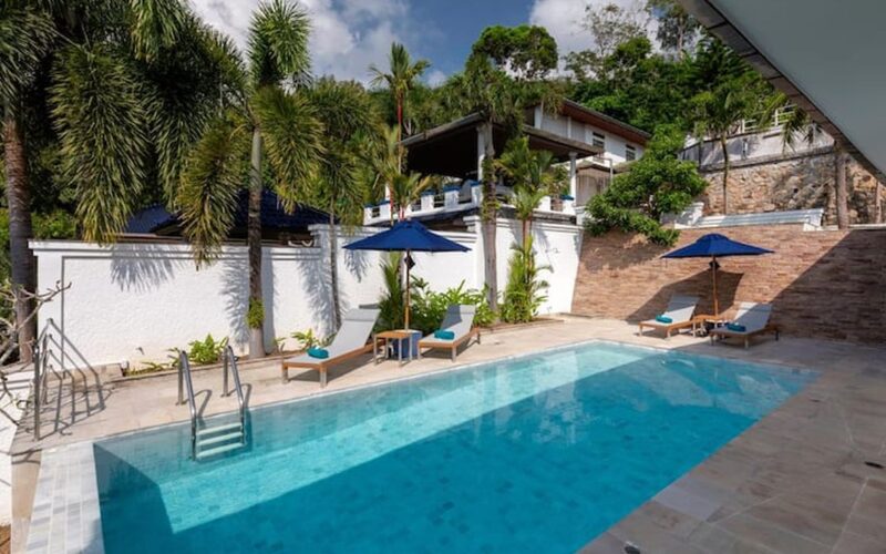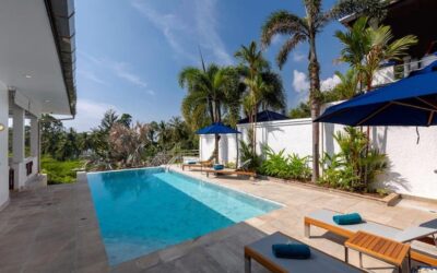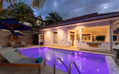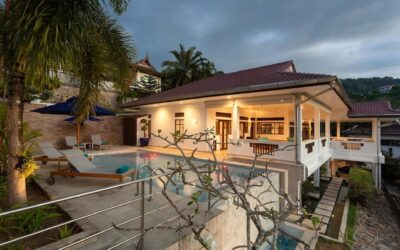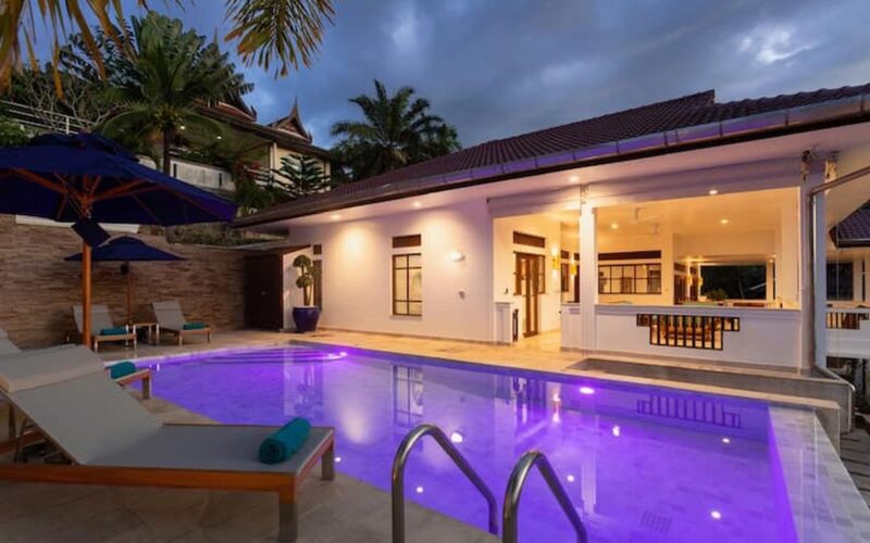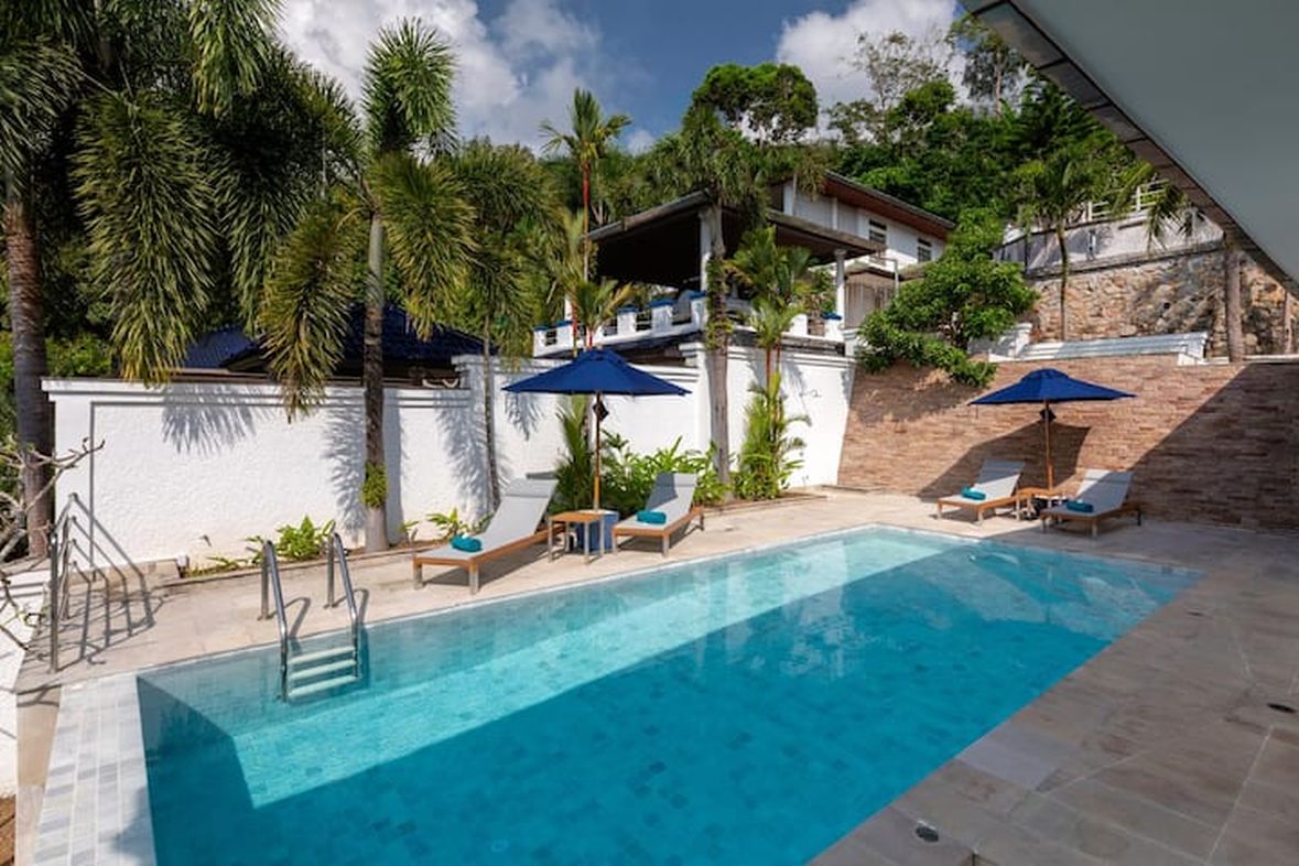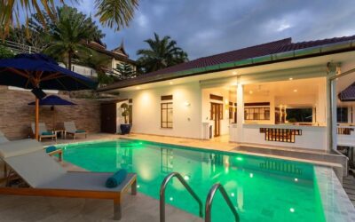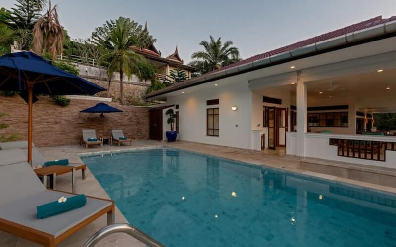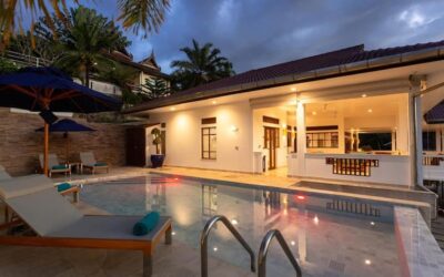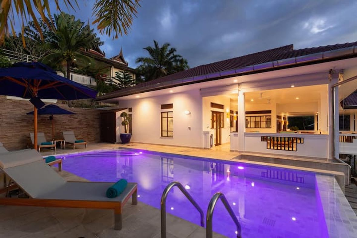 This beautiful three bedroom, three bathroom ensuite villa is in the wonderful location Kata, south of Phuket. The pool deck is sheltered on three sides and screened for privacy.