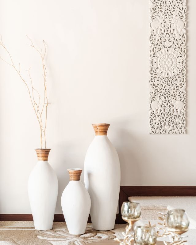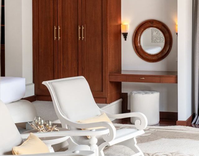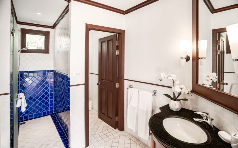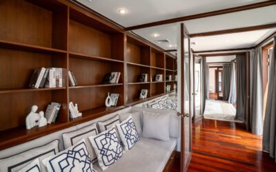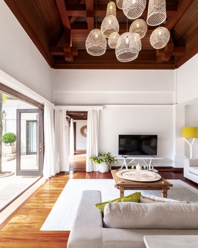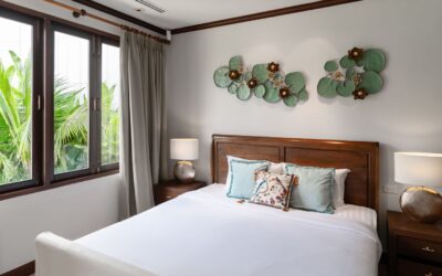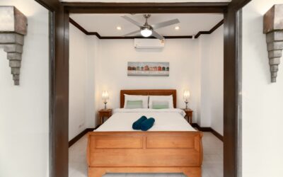 Folding glass doors in the living and dining rooms open out to the beautiful ocean blue pool and tropical gardens, while the vaulted pitch roof in the living room heightens the sense of space and light in these large, airy rooms. Big white sofas invite you to put your feet up and relax! A long, sand washed deck runs the length of the dining and living room and features a large modern BBQ, water urn and offers outdoor dining under the stars. The Villa’s 10 meter pool boasts underwater lighting and a large Jacuzzi with both jet and bubble features. The Sala day bed deck has a vaulted ceiling, fan and music system, providing a cool place to chill out with a drink or gather with family and friends. The outdoor pool bar is perfect for that evening sun-downer drink! This outdoor space has a dedicated bathroom with rain shower and hand shower unit, so there is never a need for visitors to enter the ensuite bathrooms.The villa gardens are lush with flowering heliconia, star jasmine and frangipani. Tropical blossom trees provide shade and are artfully lit for night ambience. Golden cane palms, foxtail palms and exotic traveller’s palms create additional screening and privacy.