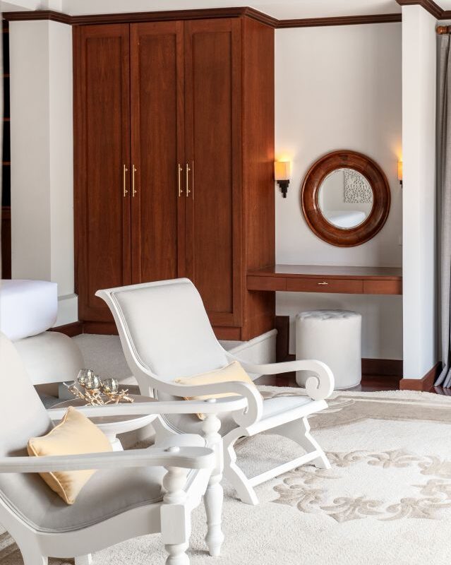 The villa accommodates 10 – 12 guests comfortably. The Main Villa has three bedrooms. The Master Bedroom offers a super-king size four poster bed, lounge area and luxury ensuite bathroom, and features a private spa which opens out onto the gardens. The Guest Master Bedroom offers a teak king size bed, and shares a beautiful spa bathroom with the Twin Bed Guest room which offers two Balinese Sleigh beds. All three bedrooms are equipped with cable TV and DVD players. The Garden Suite is a self-contained garden villa. The main bedroom features a king size bed, with a mini fridge, cable TV, DVD player and iPod docking system in the lounge area. The twin bed room is accessed via a connecting door. The twin beds may be converted to a second king size bed if preferred. A beautiful shared bathroom with ‘his’ and ‘hers’ sinks and rain shower runs the length of the Garden Suite. A bright modern kitchen features a state of the art cooker and oven, double door fridge with filtered water and ice dispenser, and microwave oven. Enjoy a casual breakfast or a platter of fruit at the granite breakfast bar! A separate Thai kitchen at the rear of the villa provides additional cooking facilities. Washing machine and dryer complete the service facilities.